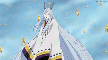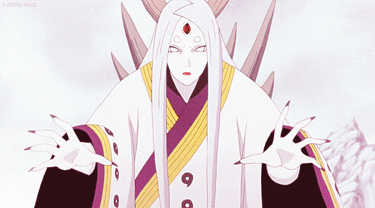 Hagoromo would confront his mother about his which she told him a bit about the clan she hailed from not knowing what love is and expressing she'd lost faith in humanity. Her son trying to reason with her but it fell upon deaf corrupted ears as she used her youngest son as a puppet to attack his brother. Hagoromo would have to kill and revive his brother before the pair would be forced to fight their own mother. This very battle raged on for months; nearly a year of constant fighting which reshaped the land entirely from the destructive power each person possessed. In some desperation, Kaguya would integrate with the God Tree and became the Ten-Tails though some believe she actually absorbed the tree to become it making her the true first ever Jinchūriki with her eldest son becoming the second.Upon defeat, her sons sealed her within the moon with Hamura deciding to remain by his mother's side saying that despite everything she was still their mother.Unbeknownst to them, upon her sealing, Kaguya had expelled a sludge like creature from her left arm. This would become Black Zetsu who would proclaim himself as her will manifested but some theorize he was actually the paranoia and fear or 'black stain' of her corruption she'd expelled from her very being. This could be due to her last moment of realization that her sons were strong enough that they didn't need her to protect them any longer or that she regretted her betrayal towards her sons...